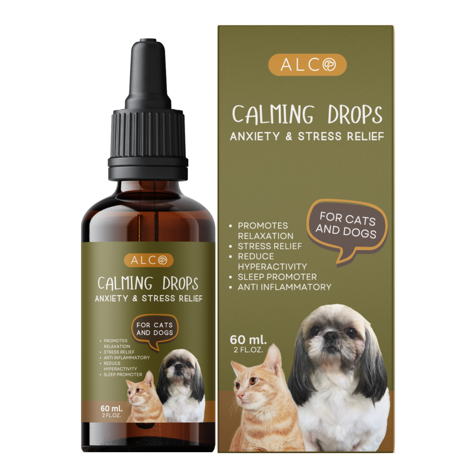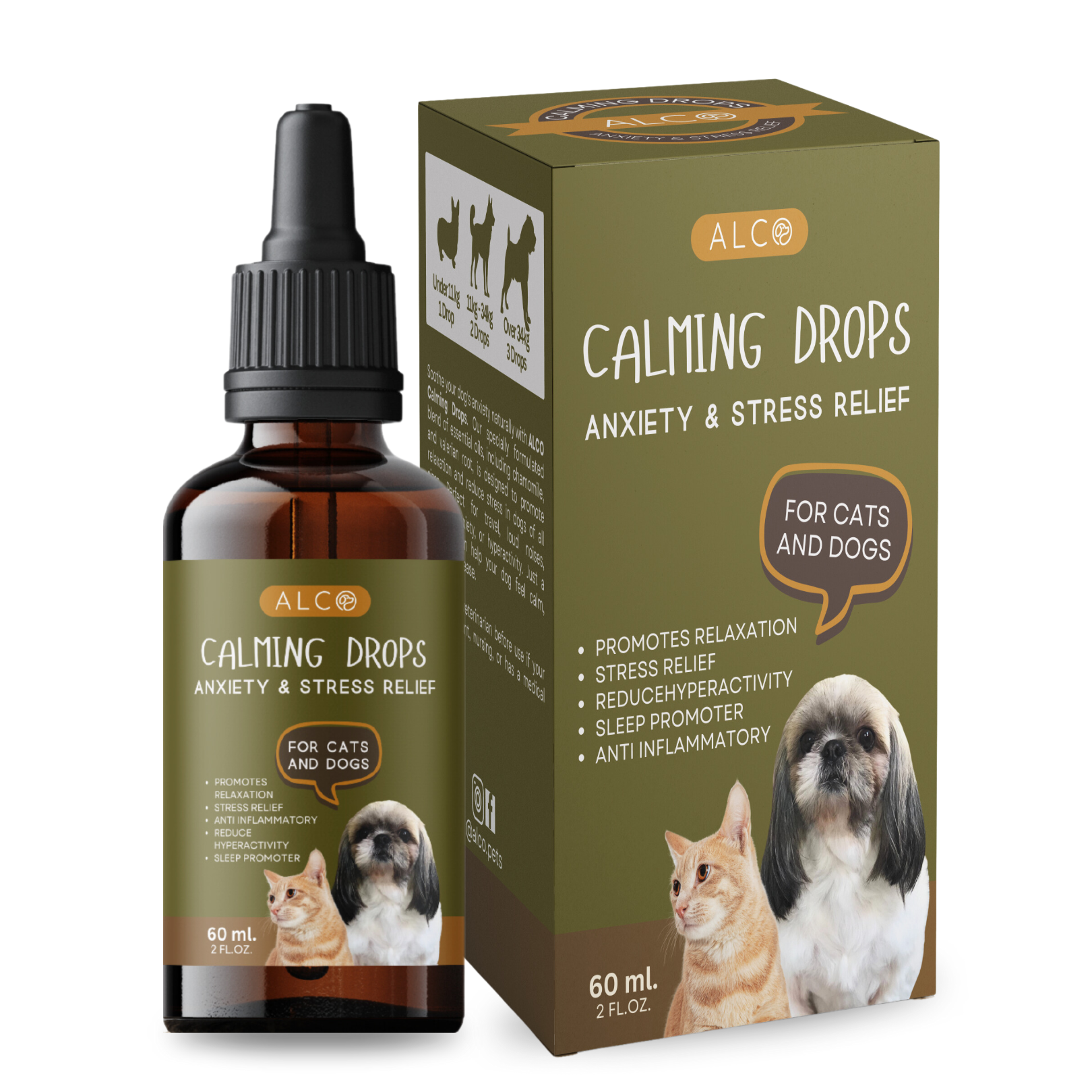 Alco Calming Drops of omega 3-6-9 have a natural calming effect which is shown to help relieve stress, separation anxiety, travel issues, constant barking, aggressive behavior and fear of storms, fireworks and anxiety related conditions. This oil also has powerful anti-inflammatory properties, which have shown to help pain relieve, joint mobility, shiny coat and anxiety relief for dogs and cats who fear loud noises or separation anxiety.
