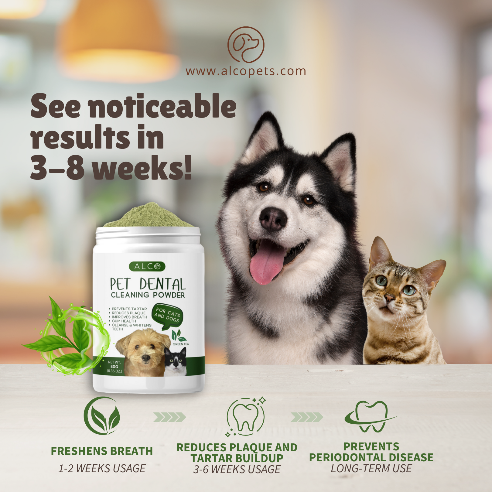 Promote better dental hygiene for your furry friends with an effortless daily addition to their diet—try Alco Pet Dental Cleaning Powder today!